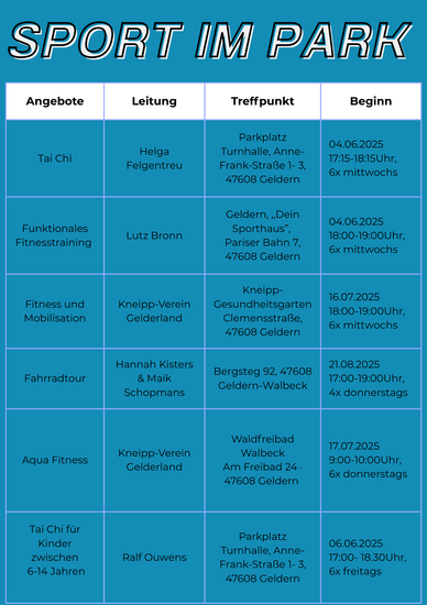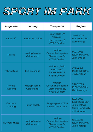Bewegung unter freiem Himmel: Sport im Park macht es möglich! Wir haben in Kooperation mit örtlichen Sportvereinen zahlreiche Sportangebote organisiert, an denen ihr diesen Sommer kostenfrei und ohne Anmeldung teilnehmen könnt. Wir freuen uns auf euch und wünschen viel Spaß!